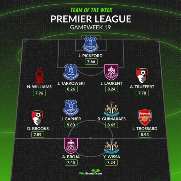 中场:布鲁克斯(伯恩茅斯,7.89分)、加纳(埃弗顿,9.80分)、吉马良斯(纽卡斯尔,8.65分)、特罗萨德(阿森纳,8.93分)