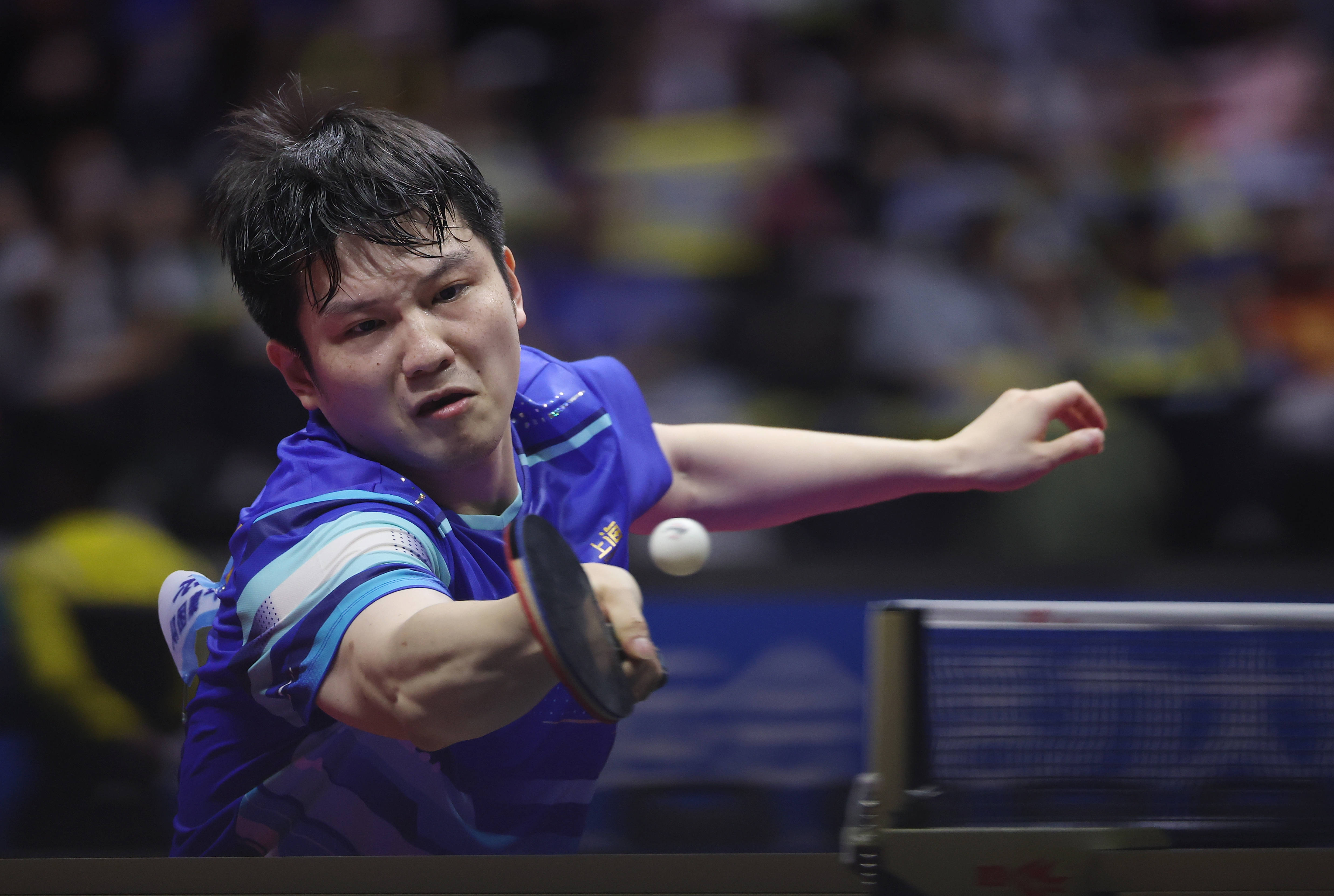11月15日,樊振东在比赛中回球。新华社记者 刘续 摄第四局,樊振东执意顶住,一齐朝上,11:7再度扳平局分。