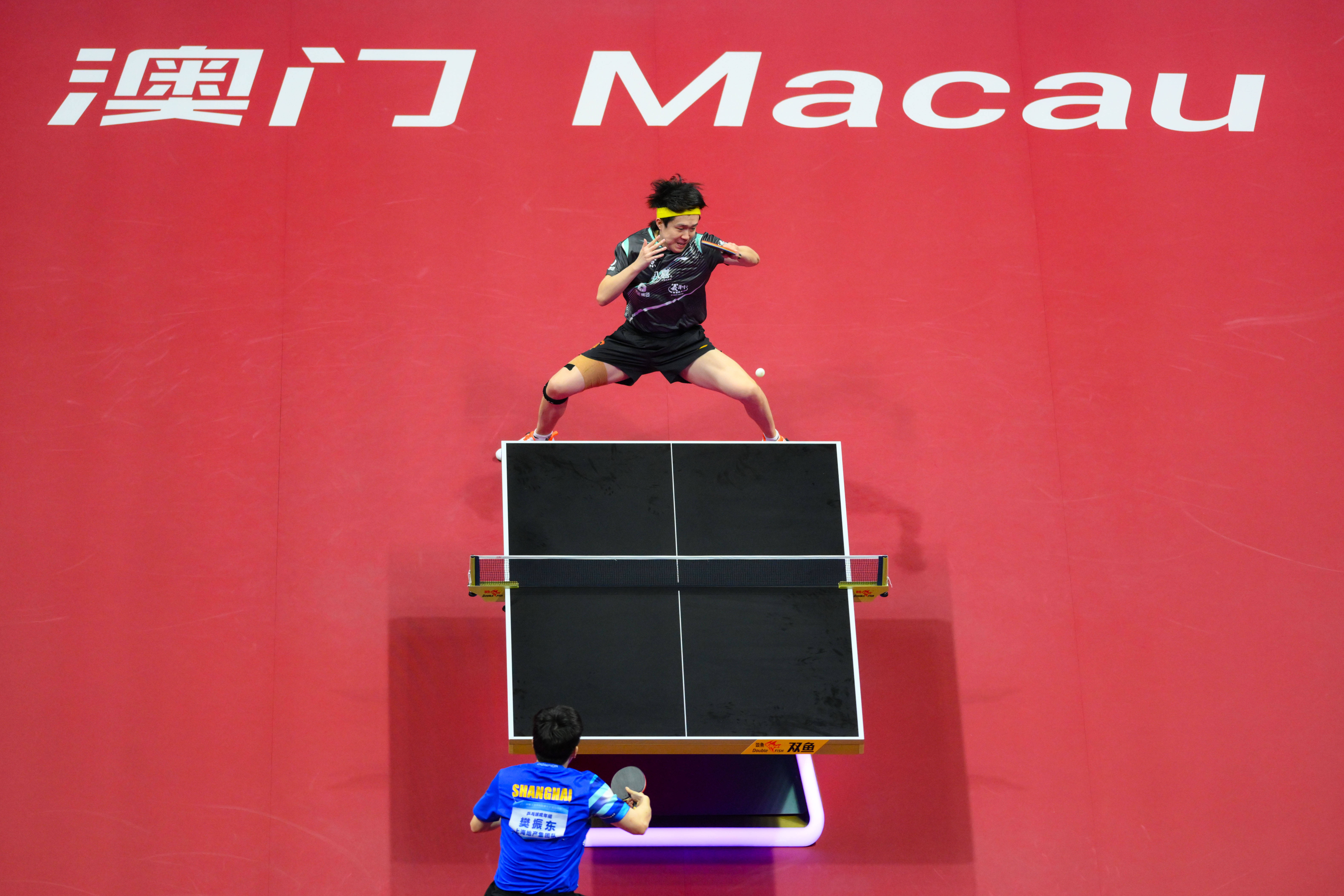 11月15日,王楚钦(上)在比赛中回球。新华社发(张金加摄)15日中午,澳门星河综艺馆东说念主声得意,现场不雅众不遗余力地为两位选手加油。