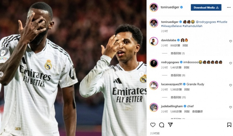 1月30日讯 在本轮欧冠,皇马3-0客胜布雷斯特,罗德里戈完成双响。赛后,吕迪格在社媒晒出和罗德里戈一说念单手遮脸的庆祝手势+并配上色彩:👋🏾👋🏾😂。